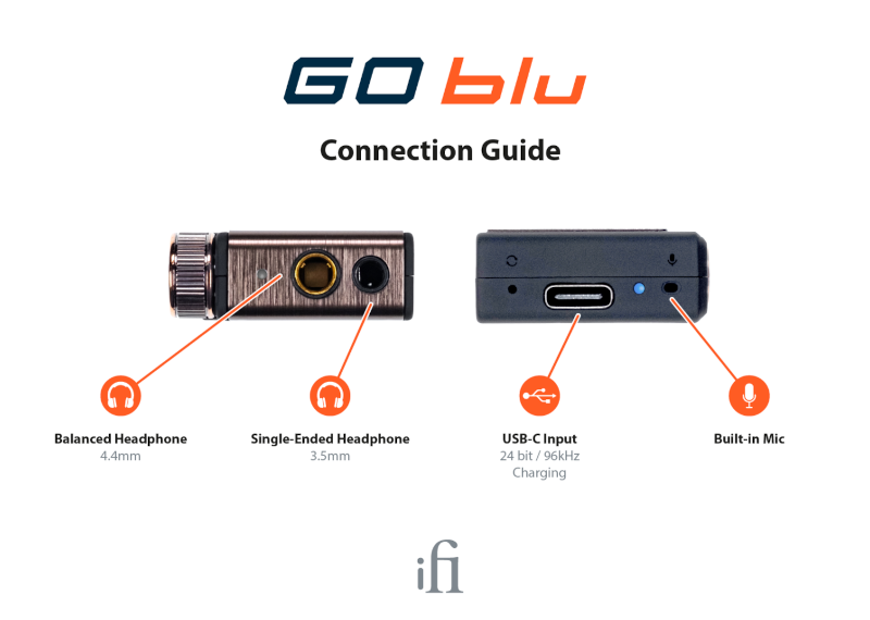 iFi-Audio Go Bluetooth D/A-muunnin ja kuulokevahvistin. Go Blu sisältää Qualcommin uusimman neliytimisen QCC5100 Bluetooth sirun, joka takaa toimivuuden kaikkien uusimpien Bluetooth formaattien kanssa. Lisäsäätöjä laitteesta löytyy XSpace laajentamaan äänikenttää ja XBass korostamaan bassoääniä. Laite kulkee helposti mukana pienen koonsa takia (55 x 34 x 13 mm) ja 26g painokaan ei taskussa tunnu!