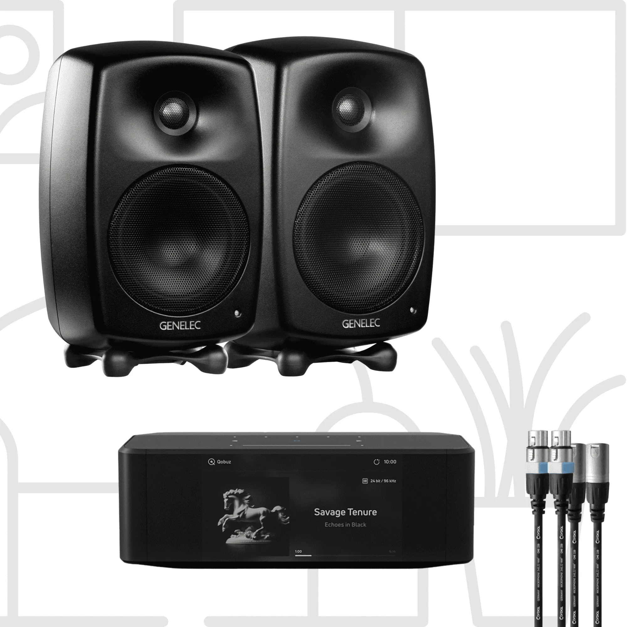 Genelec G Three -aktiivikaiuttimet ovat täydellinen pari tälle soittimelle. Suomessa valmistetut kaiuttimet sisältävät omat optimoidut vahvistimensa jokaiselle elementille, mikä tarkoittaa, että et tarvitse erillistä päätevahvistinta. G Threen kompakti koko kätkee sisäänsä valtavan dynamiikan ja puhtaan toiston, joka ulottuu yllättävän alas ilman erillistä subwooferia. Kaiuttimien takapaneelin säätimillä voit optimoida äänen juuri sinun huoneesi akustiikkaan sopivaksi.