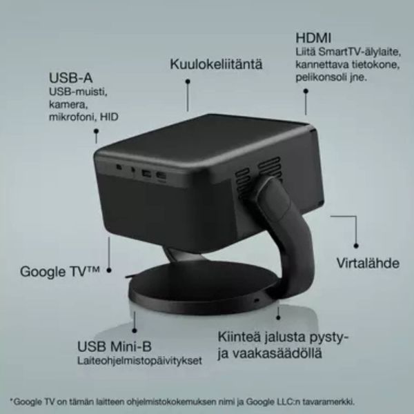 - Ominaisuudet: Automaattinen trapetsikorjaus, Sisäinen kaiutin, Chromecast, Google Search, Vaaka- ja pystysuuntainen trapetsikorjaus, Pikakäynnistys/-sammutus, Quick Corner