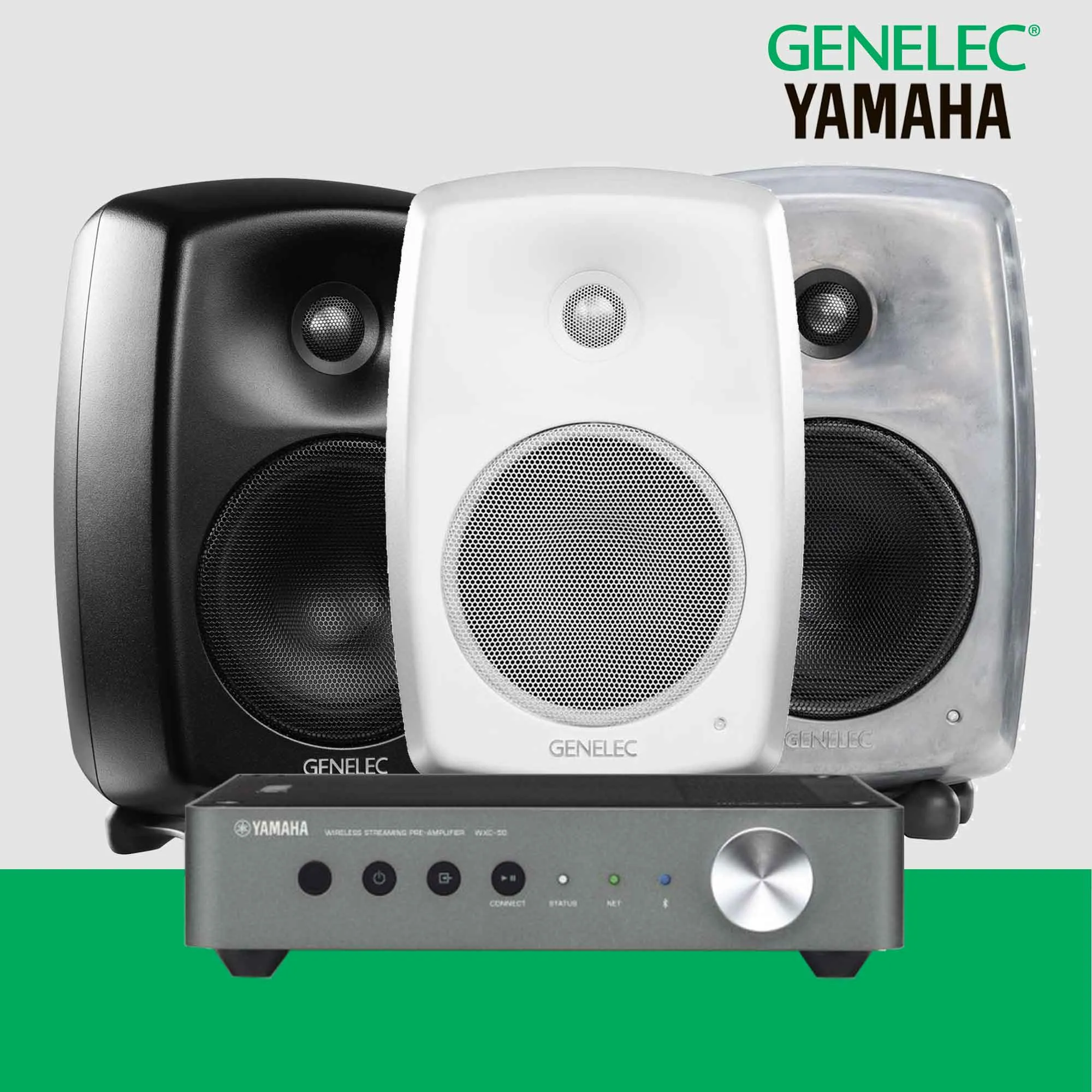 Genelec G Three (B) kaiuttimet, joihin saat tässä paketissa kaupan päälle Yamaha WXC-50 verkkosoittimen. Yamaha WXC-50 on vaihtolaite, joka on tullut meille kevään vaihtokampanjassa. Laitteet on visuaalisesti hyväkuntoisia, olemme testanneet ne ja annamme WXC-50 esivahvistimelle 6 kk takuun.