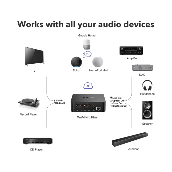 Multiroom-tuki: Kyllä (WiiM-ekosysteemiin tai AirPlay 2 / Chromecast-ympäristöön)