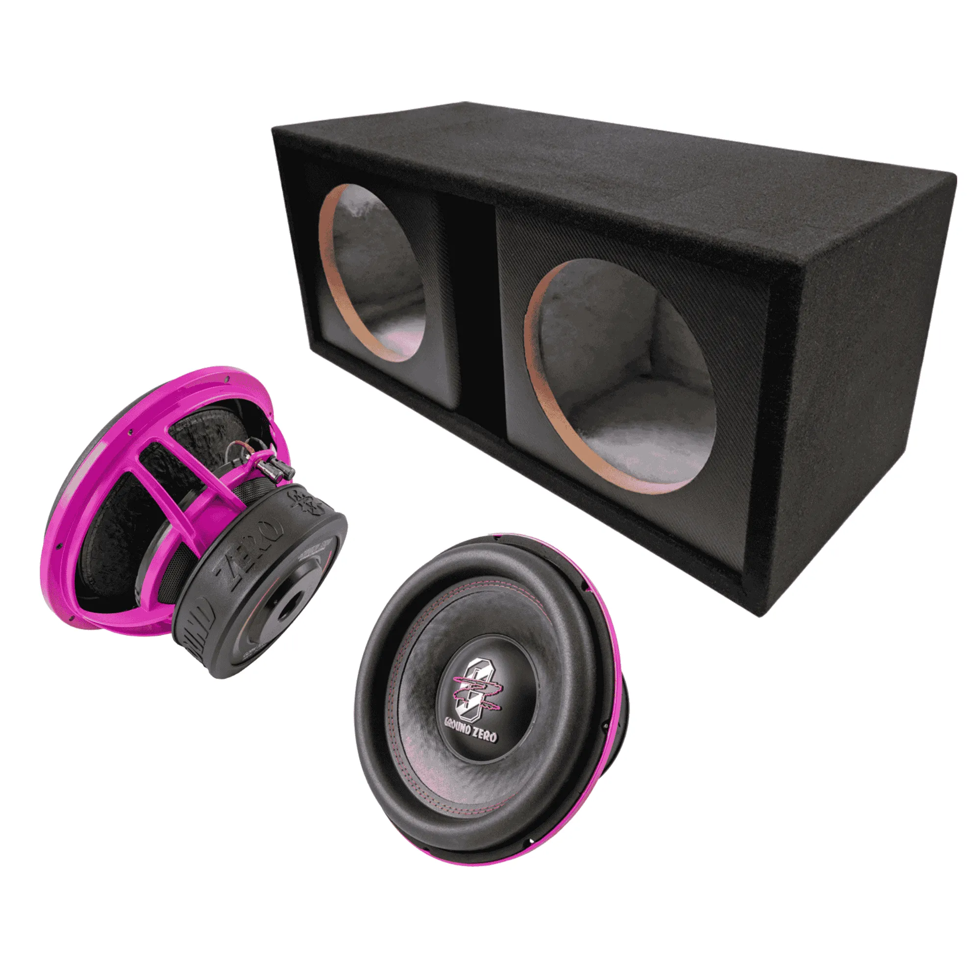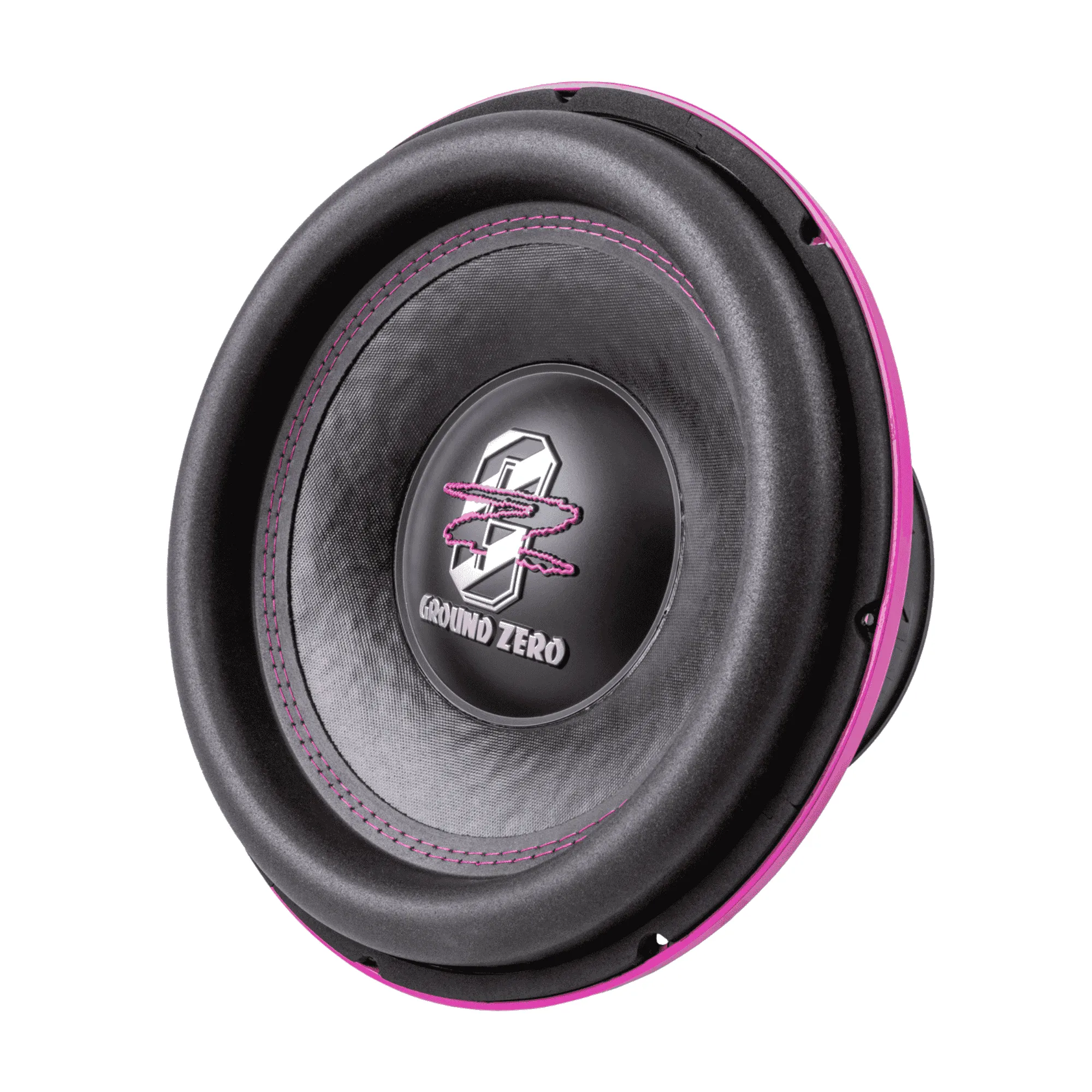 Ground Zero BASSKIT Radioactive PINK sisältää 2 kpl GZRW 300SPL PINK subwoofereita ja järeän 4-AI212SLOT kotelon
