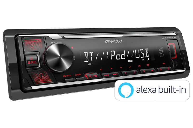 Kenwood KMM-BT209 autosoitin Bluetoothilla, punaisilla näppäin valoilla ja Kenwoodin puhelinappilla.
