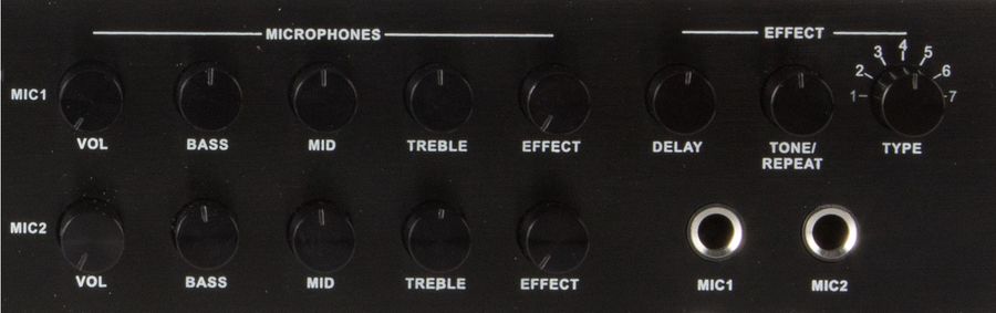- Kaksi erillistä mikrofonikanavaa, joille omat äänen ja kaiun voimakkuuden säätimet sekä taajuuskorjaimet basson, keskiäänen ja diskantin säädöillä
