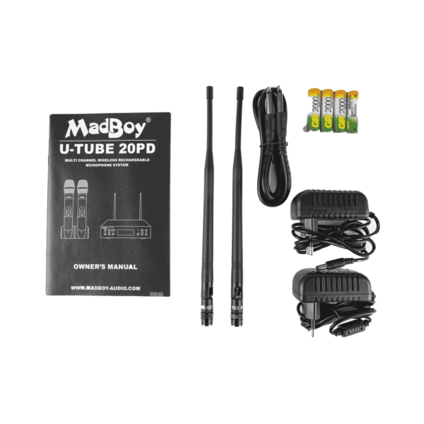 MadBoy U-TUBE 20PD -sarja koostuu kahdesta korkealaatuisesta mikrofonista, laturista ja vastaanottimesta LCD-näytöllä. Mikrofonit hyödyntävät uusinta piiritekniikkaa, mikä mahdollistaa mikrofonien ja laturin äärimmäisen laadun. Tämä on ennennäkemätöntä tämän hintaluokan mikrofoneissa.