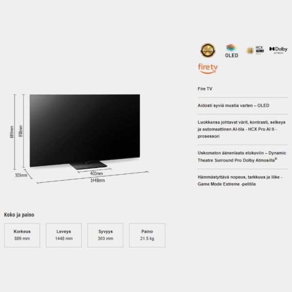 Lue lisää: https://www.panasonic.com/fi/consumer/televisiot/oled-4k-tv/tv-65z85aeg.specs.html