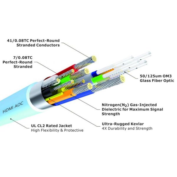 Hybridi kuituoptinen teknologia mahdollistaa häviöttömän signaalin viennin pitkissä vedoissa ja samalla RFI ja EMI häiriöt pysyvät minimaalisina. 48 Gbps kaistanleveys mahdollistaa ULTRA HD 8K 7840x4320@60Hz signaalin kuljetuksen aina 100 metriin asti.