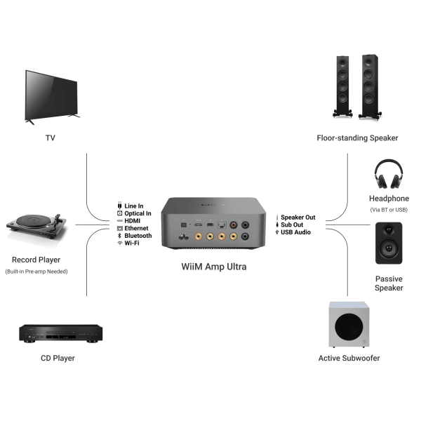WiiM Amp Ultra toimii täydellisesti myös TV:n kanssa: HDMI ARC -liitännän ansiosta saat parempaa ääntä televisioosi yhdellä johdolla. Lisäksi voit yhdistää siihen erillisen subwooferin saadaksesi vieläkin täyteläisemmän äänikokemuksen elokuviin ja peleihin.