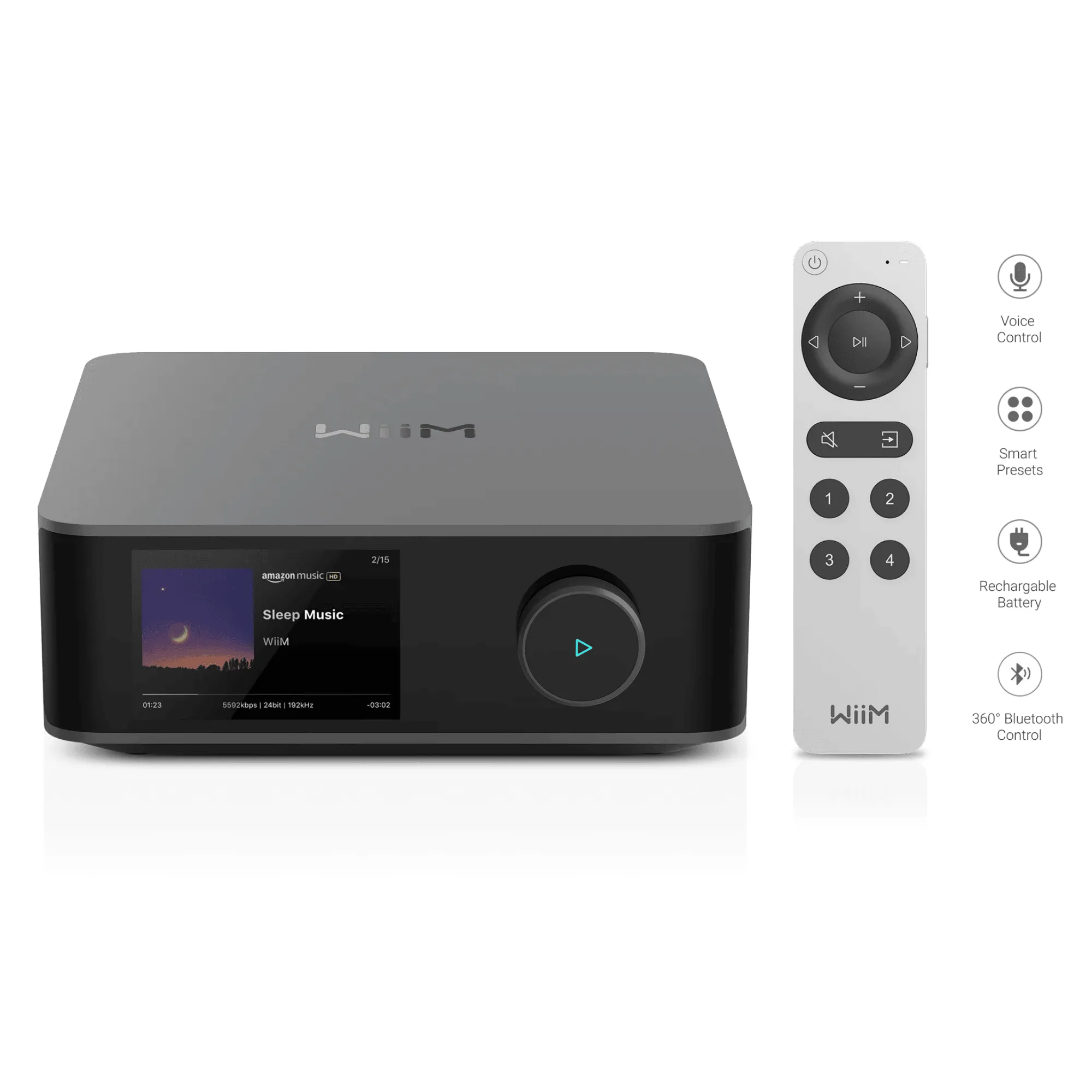 Laitetta voi ohjata helposti WiiM-sovelluksella, mukana tulevalla kaukosäätimellä tai jopa äänikomennoilla (esimerkiksi Alexan tai Google Assistantin kautta). Se sopii niin yksittäiseen huoneeseen kuin koko kodin kattavaan monihuonejärjestelmään.