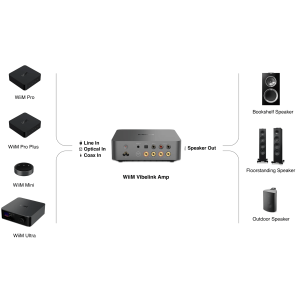 Toisin kuin monet kilpailijat, Vibelink Amp ei sisällä sisäänrakennettua striimainta – se on suunniteltu puhtaaksi vahvistimeksi käytettäväksi esim. WiiM Ultra- tai Pro Plus -striimaimien, CD-soittimen, levysoittimen (RCA), tai muiden digitaalisten lähteiden (optinen / koaksiaali) kanssa. Tämä antaa käyttäjälle täydellisen vapauden rakentaa juuri omaan käyttötarpeeseen optimoidun järjestelmän.